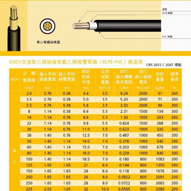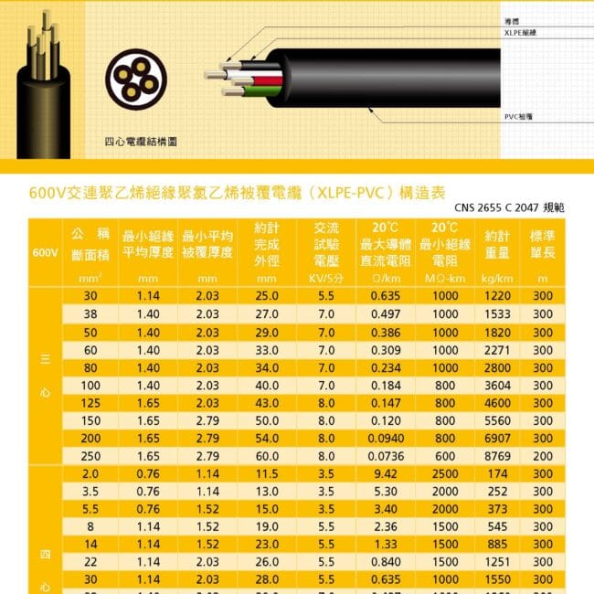 高壓電纜及中低壓電纜XLPE適用於輸配電系統用,以交連聚乙烯為絕緣體,PVC為被覆之電力電纜,絕緣耐熱性佳,電氣特性特優。故障率低,為目前高壓電纜之主流,正常使用時,其導體連續使用溫度可達90°C,緊急時可達130°C (連續12個月內不得超過3次,平均每次不超過36小時),短路時可達250°C(最大短路時間5秒) ,且重量輕,易鋪設及終端處理簡單。