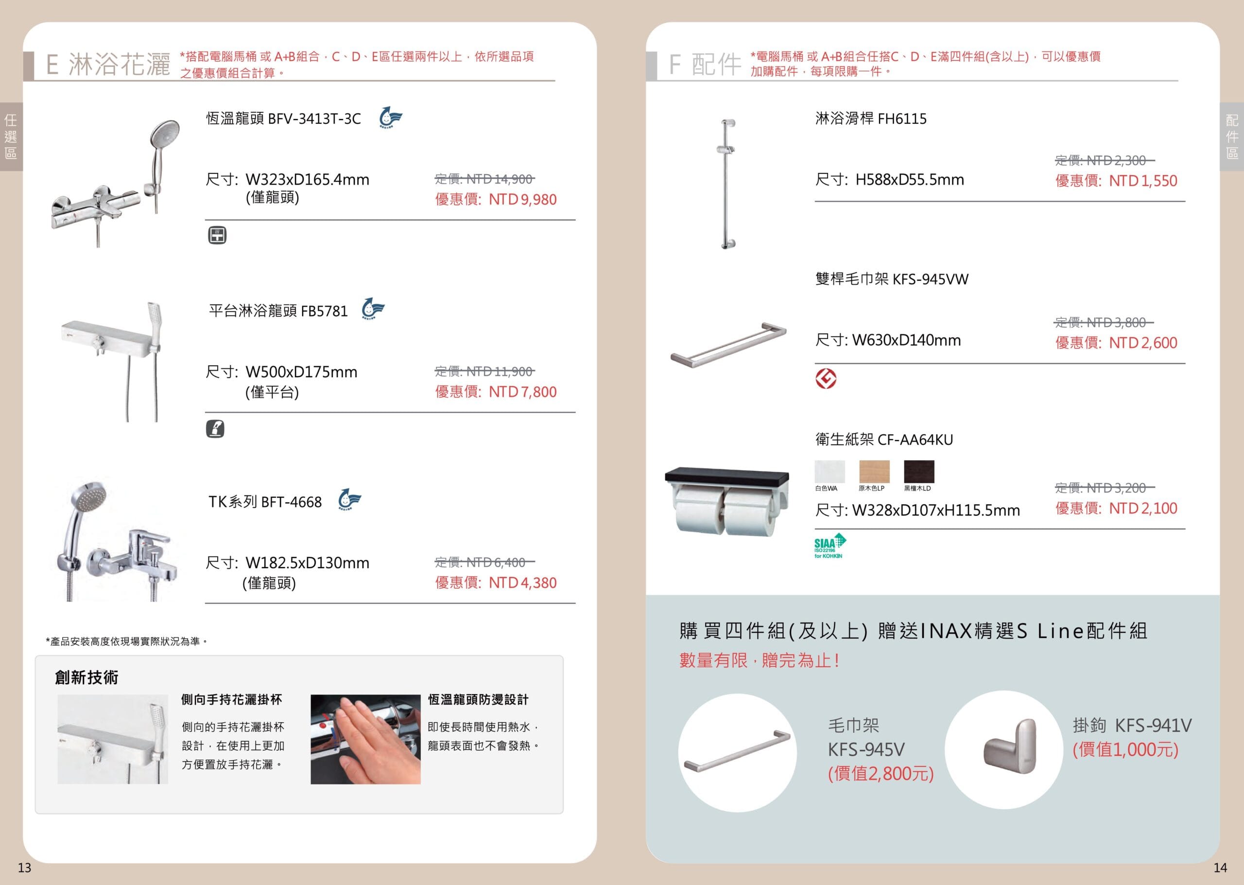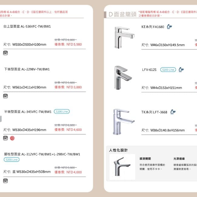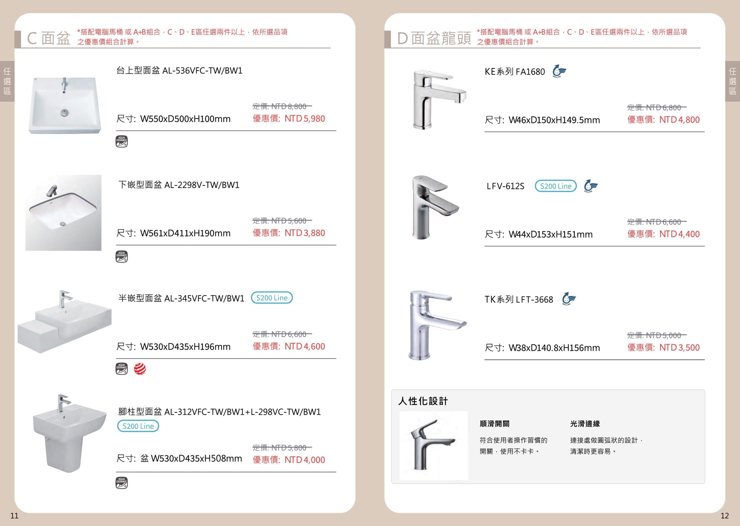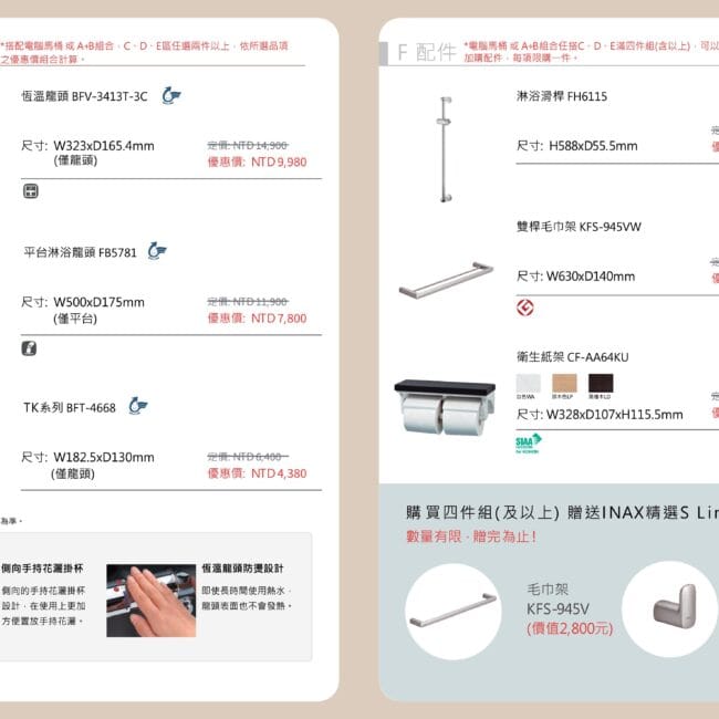 凡購買 A+B 及 C+D+E 衛浴達 4 件(含)以上 組合,可享精選配件 優惠加價購,數量有限,送完為止!