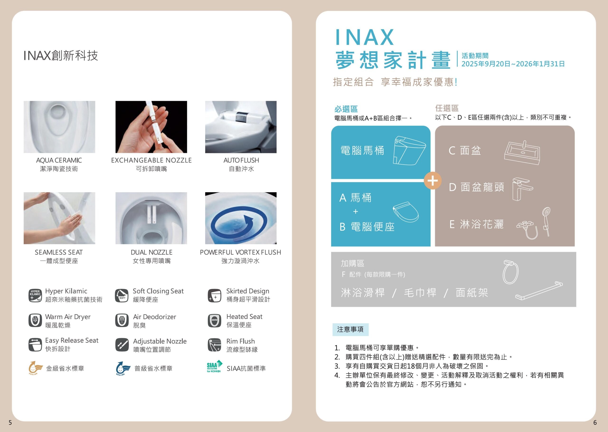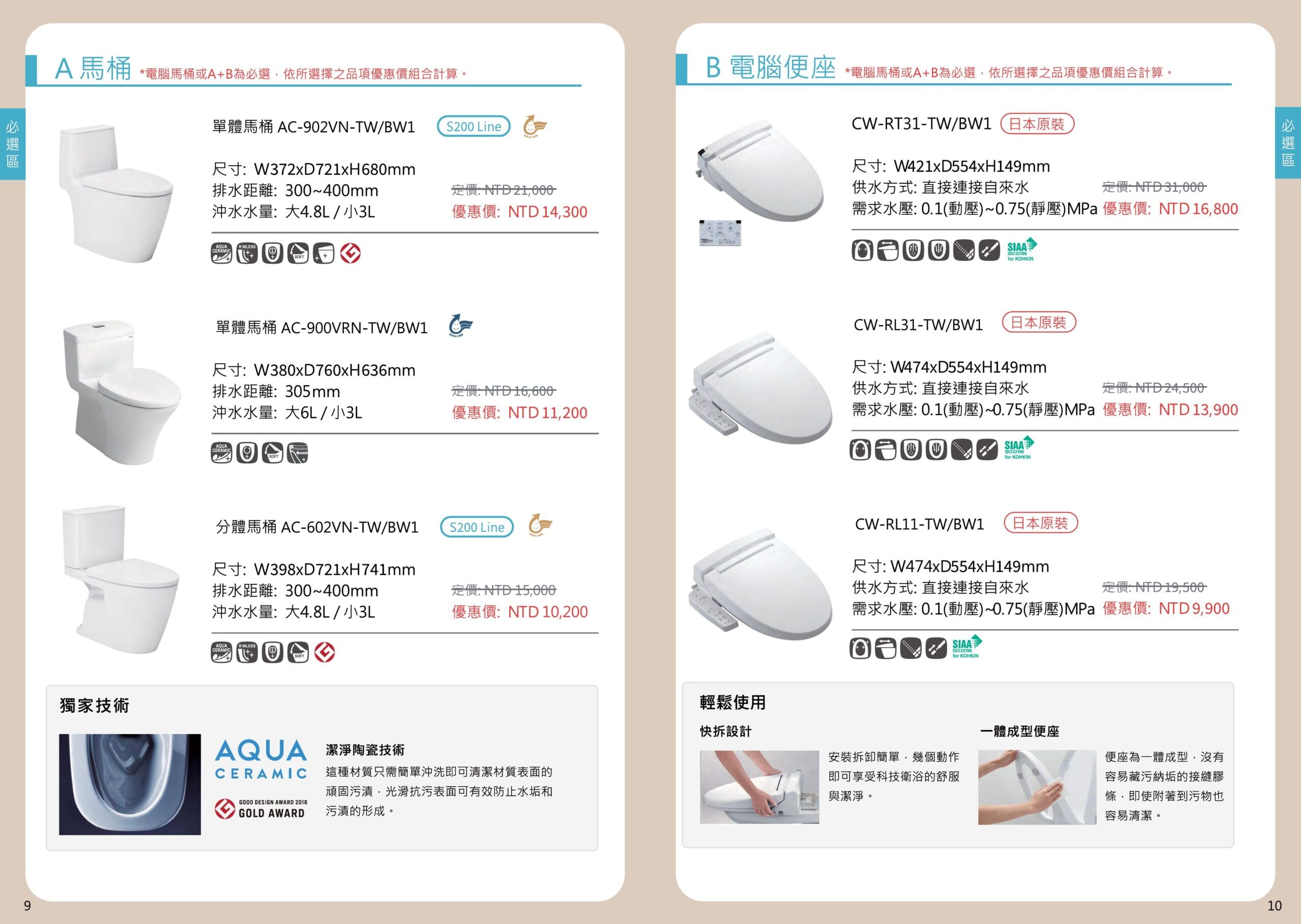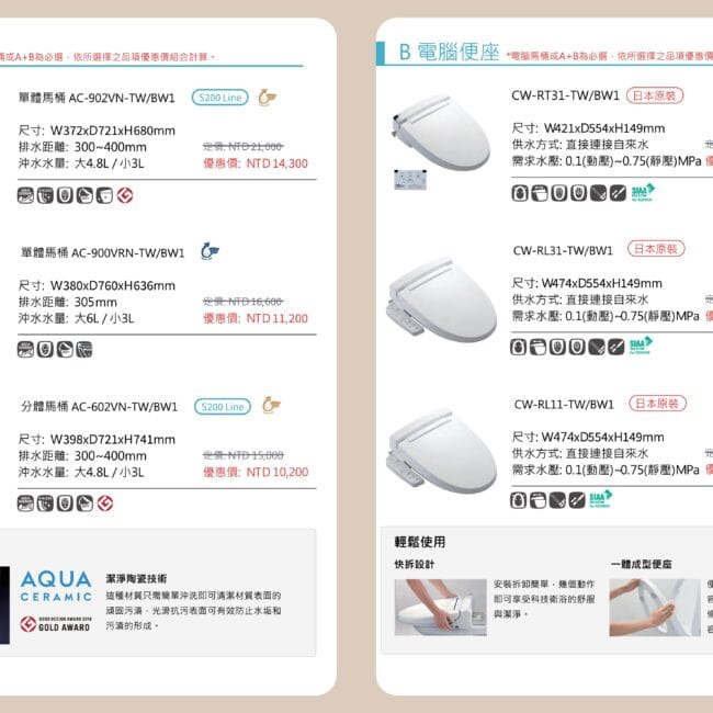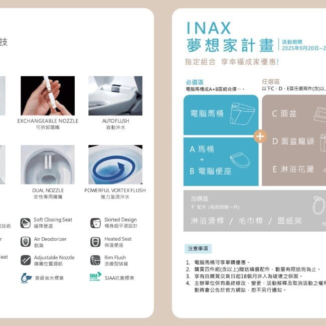 凡購買 A+B 及 C+D+E 衛浴達 4 件(含)以上 組合,可享精選配件 優惠加價購,數量有限,送完為止!
