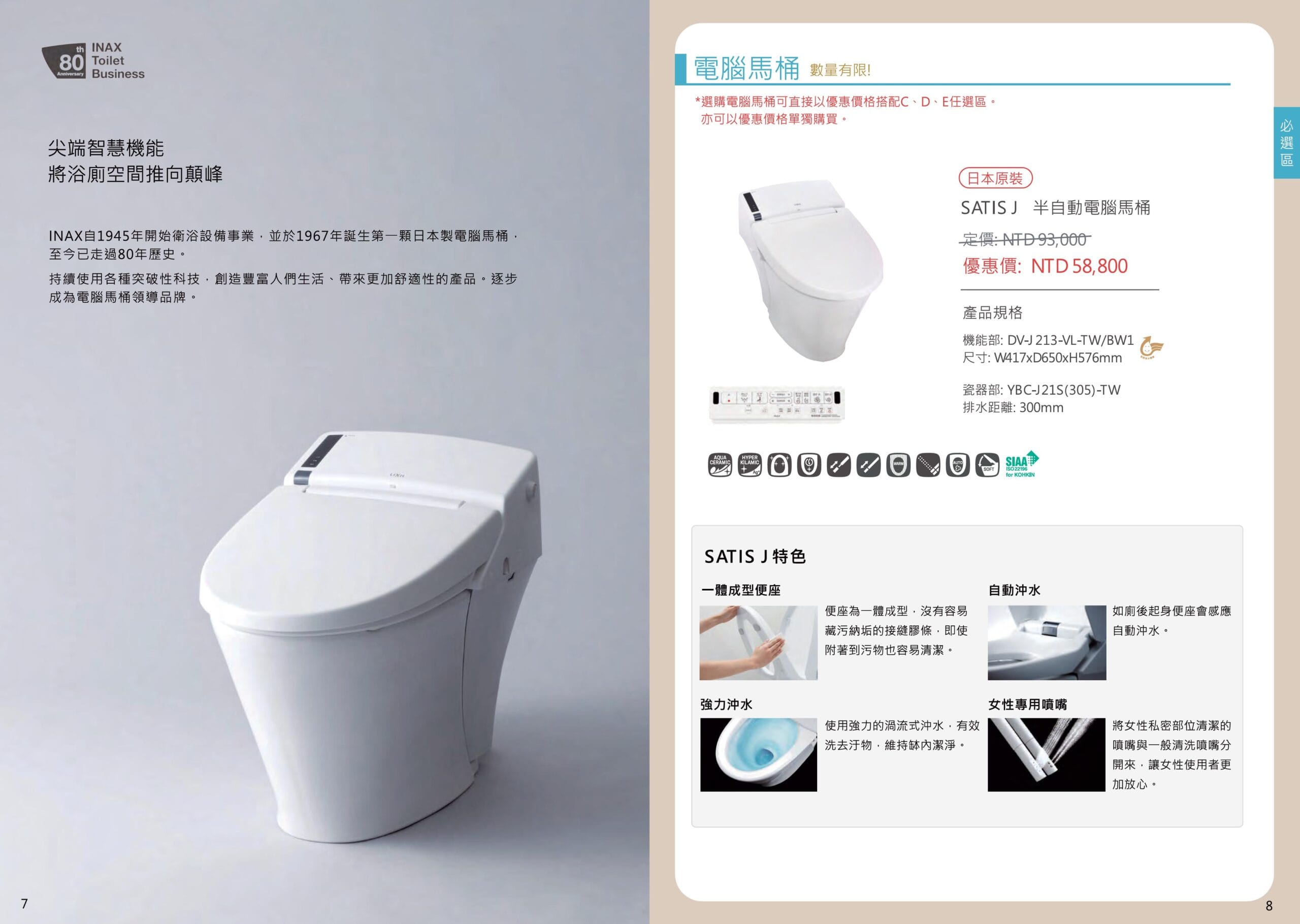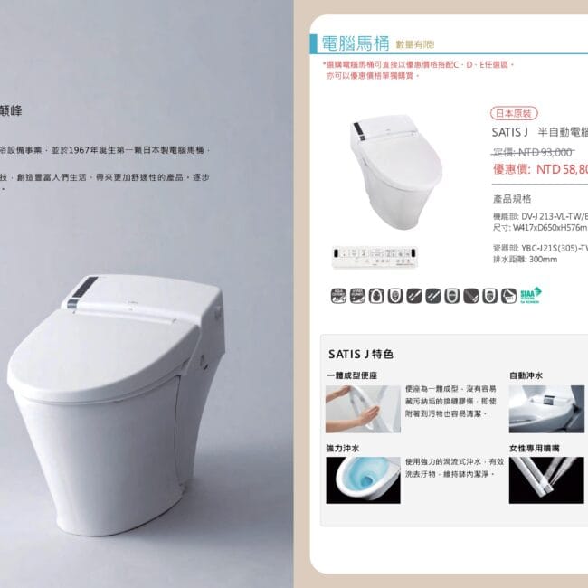 日本原裝 SATIS J 電腦馬桶 — 優惠價 NT$58,800(市價 NT$93,000),數量有限,售完為止。