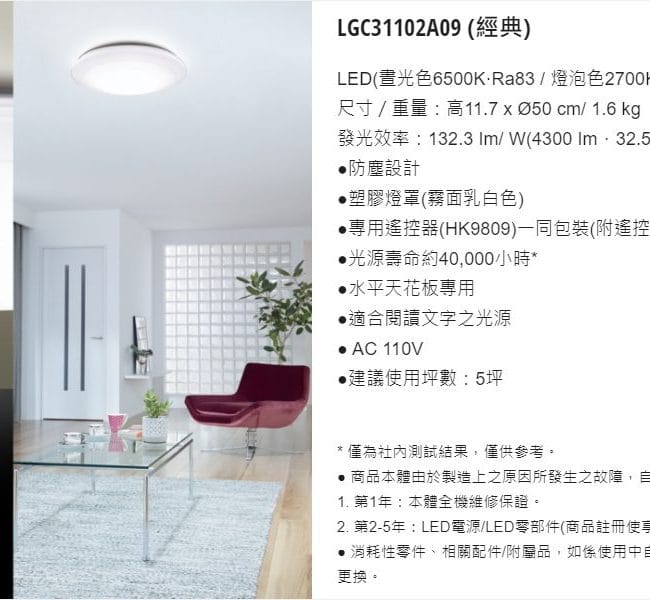 * 日本照明工業公會制定LED器具之「適用坪數」作為參考依據, Panasonic 使用坪數基準確實將光源擴散到客廳所有角落。