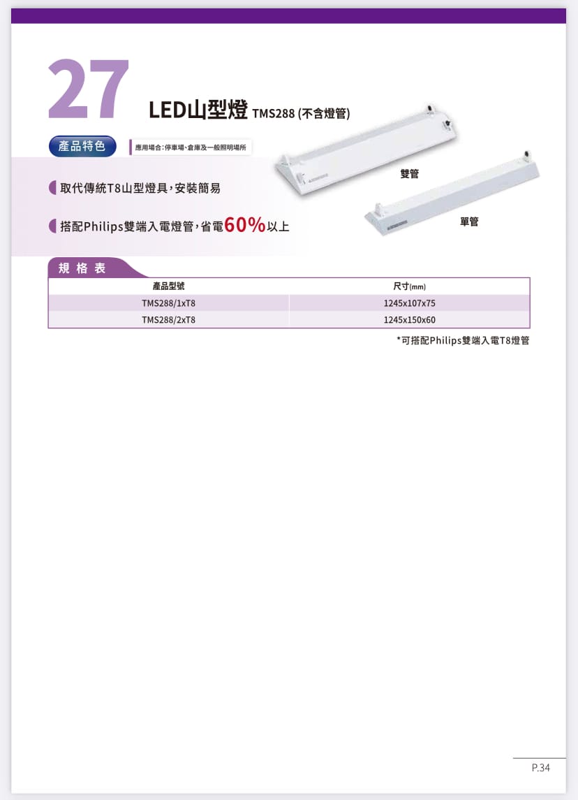PHILIPS 飛利浦 LED山型燈 TMS288 (不含燈管) 數量